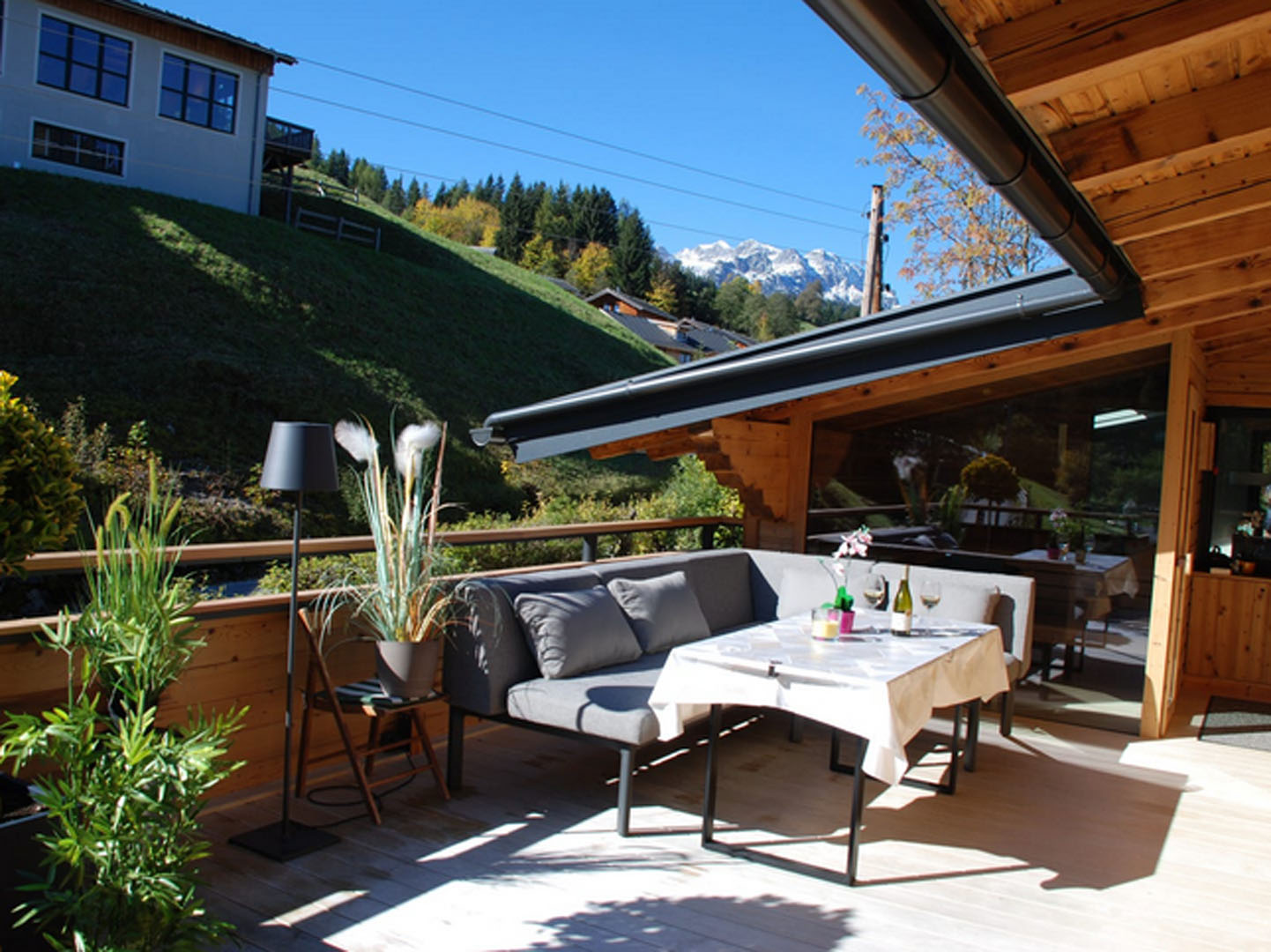 Hochwertig qualitative Ausstattung mit separatem Schlafzimmer, Boxspringbett von Marke ADA inkl. 50" Panasonic SAT-Plasma-TV, und großem Schrank. Wohnbereich mit Esstisch für 6 Personen und Lederdrehsessel, Leder Schlafcouch der Marke ADA, vollwertig ausgestattete DAN Küche mit allen Küchenutensilien, inklusive Balkon-Terrasse von ca. 24 m² mit Ambientebeleuchtung, Musiksoundanlage (Bluetooth gesteuert) und exklusiver Glas-Panorama Sauna mit Blick in die Berge – Bischofsmütze.